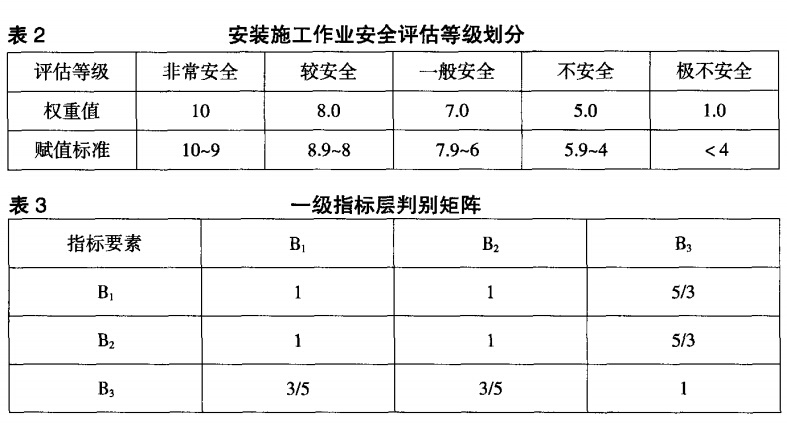 3.3一級指標層及二級指標層權重集合計算針對同一層次各指標要素實施兩兩比較從構建判別矩陣,一級指標層的判別矩陣如表3所示。針對上述指標層的判別矩陣進行層次單排序及一致性檢驗,由CI=(n)/(n一1),計算可知,CI=0.00004,RI=0.56。CR=CI,RI小于0.1,即為相應判別陣滿足一致性檢驗要求。同時,結合專家咨詢結果以及該安裝工程橋式起重機設備的安裝資料,可采用上述方法求得各二級指標層對應一級指標層的相對權重值并對各二級指標要素評分賦值,如表4所示。